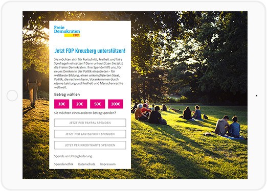 Optimierte Online-Spendenfunktion im FDP-Layout für politische Organisationen und Verbände, unterstützt durch sichere Zahlungsmethoden